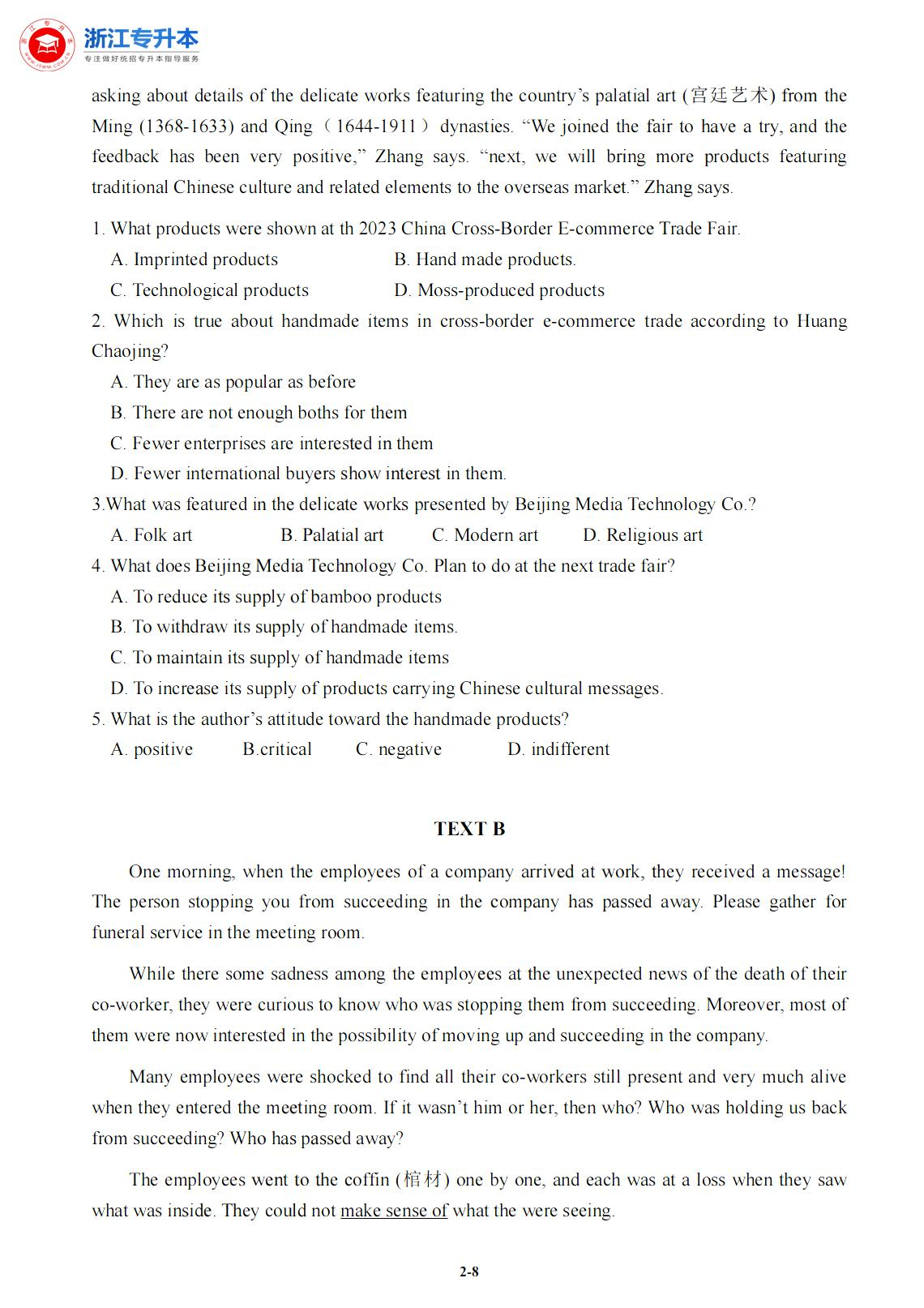 以上就是关于“2023浙江专升本英语真题及答案”的相关资讯,想要了解更多浙江专升本相关资讯(如浙江统招专升本录取通知书发放时间、成绩查询、录取分数线)的同学,可以关注浙江专升本网(http://www.jswm.com.cn/)