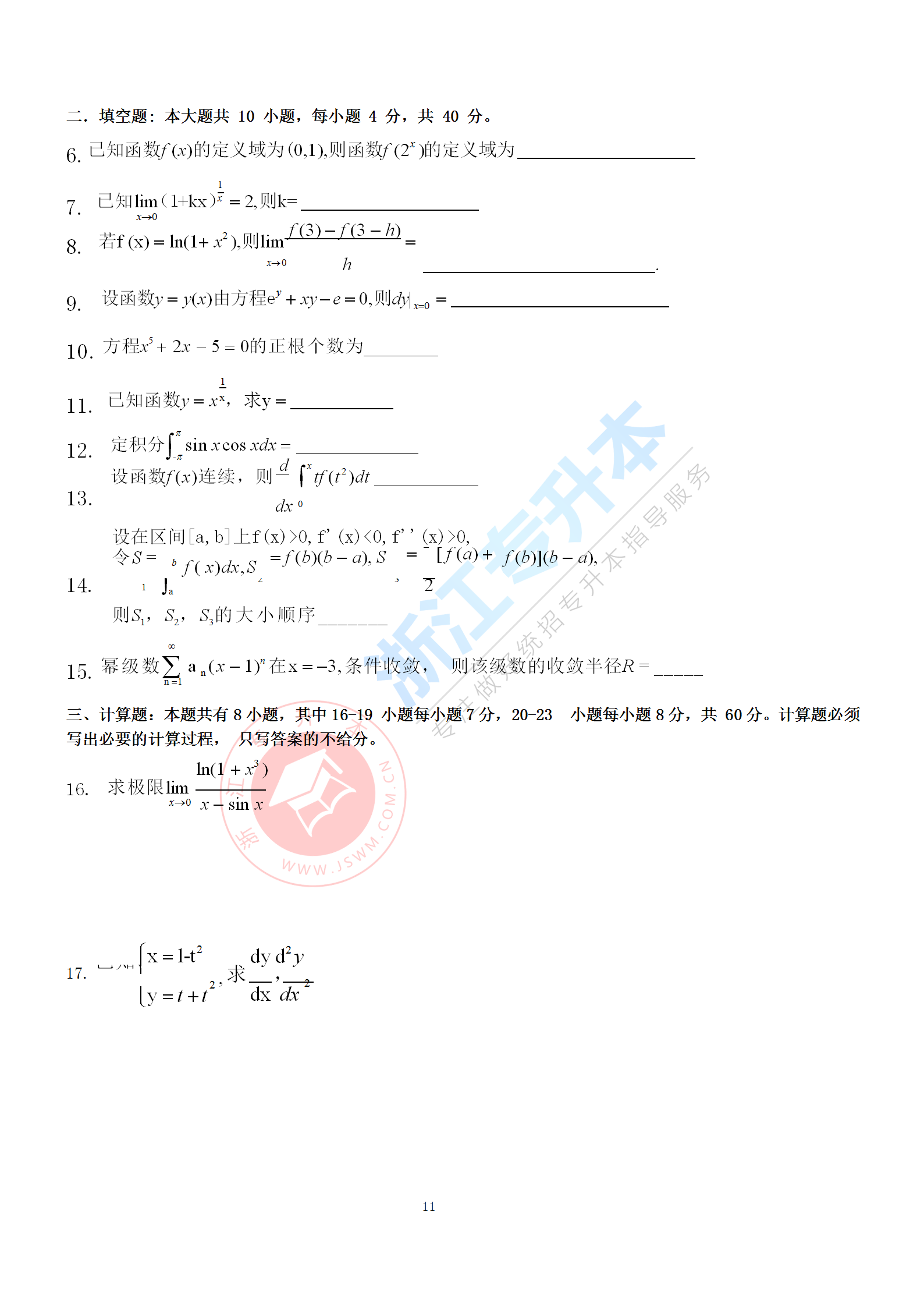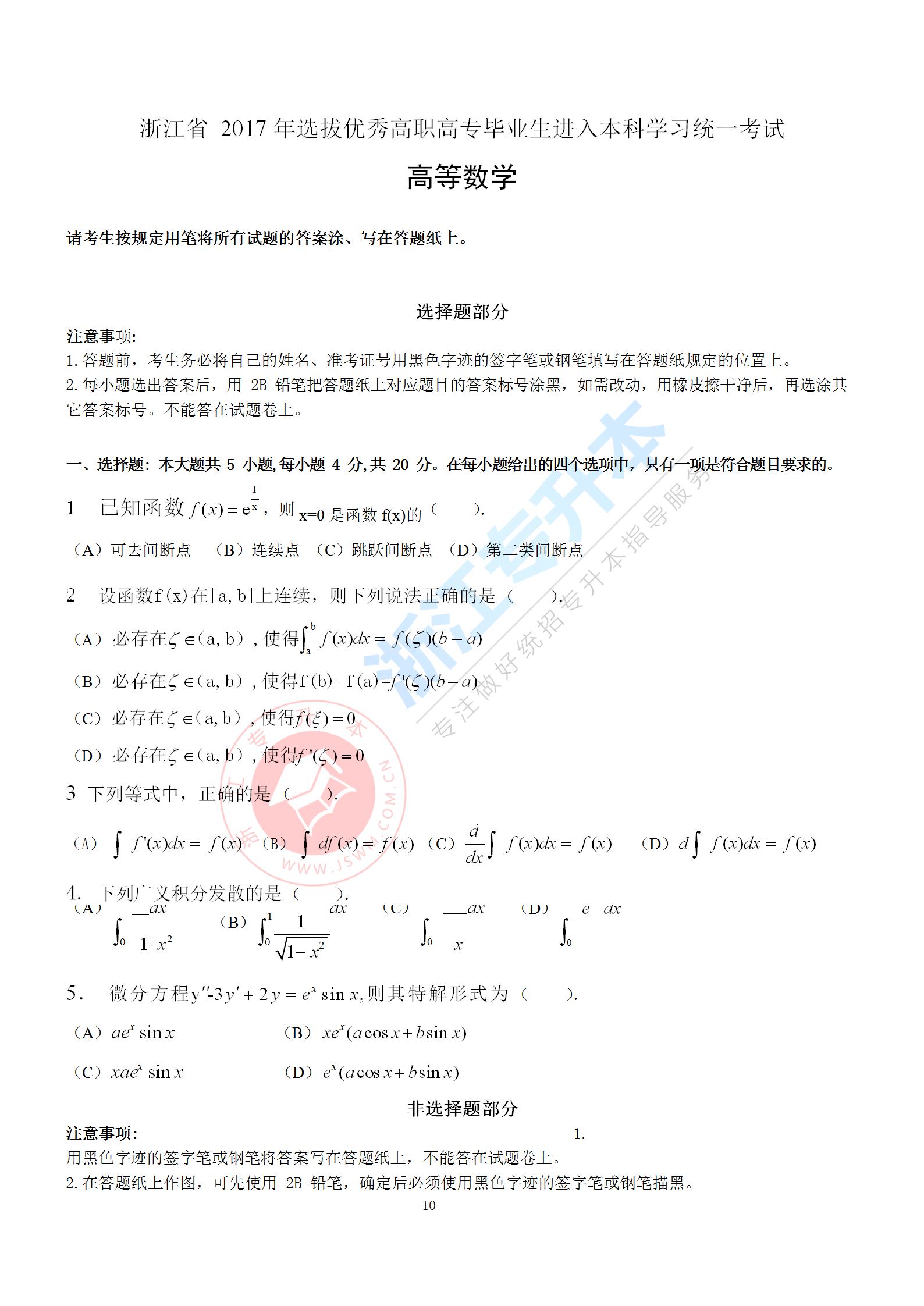 浙江专升本 >统招专升本 > 专升本试题题库 > 历年真题 > 2017年浙江专升本《高等数学》真题卷