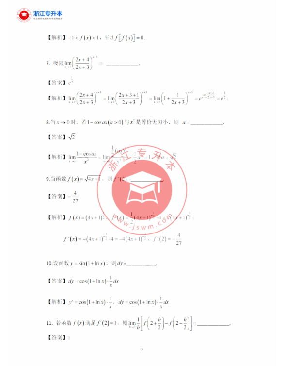 以上就是关于“2023年浙江专升本高等数学真题及答案”的全部内容,若考生还想了解更多关于浙江专升本考试的最新资讯,如浙江统招专升本成绩查询、录取分数线、录取查询等常见问题,敬请关注浙江统招专升本网(http://www.jswm.com.cn/)!