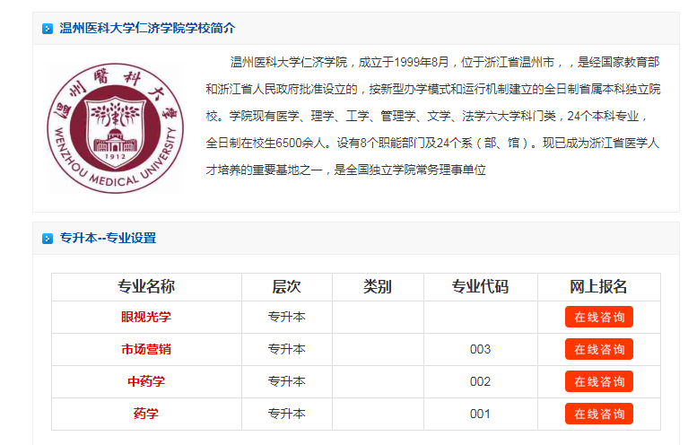 以上就是关于温州医科大学仁济学院统招专升本专业有哪些的内容,考生想了解更多关于温州医科大学仁济学院专升本动态、招生专业、报名费、学费等信息,欢迎关注浙江省专升本!