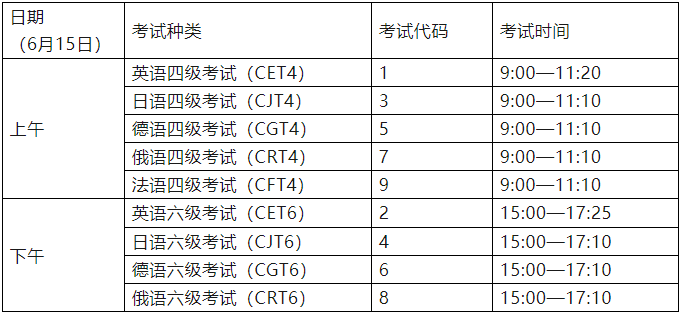 6月15日上午为英语(含日、德、俄、法)四级笔试,6月15日下午为英语(含日、德、俄)六级笔试。具体时间安排如下: