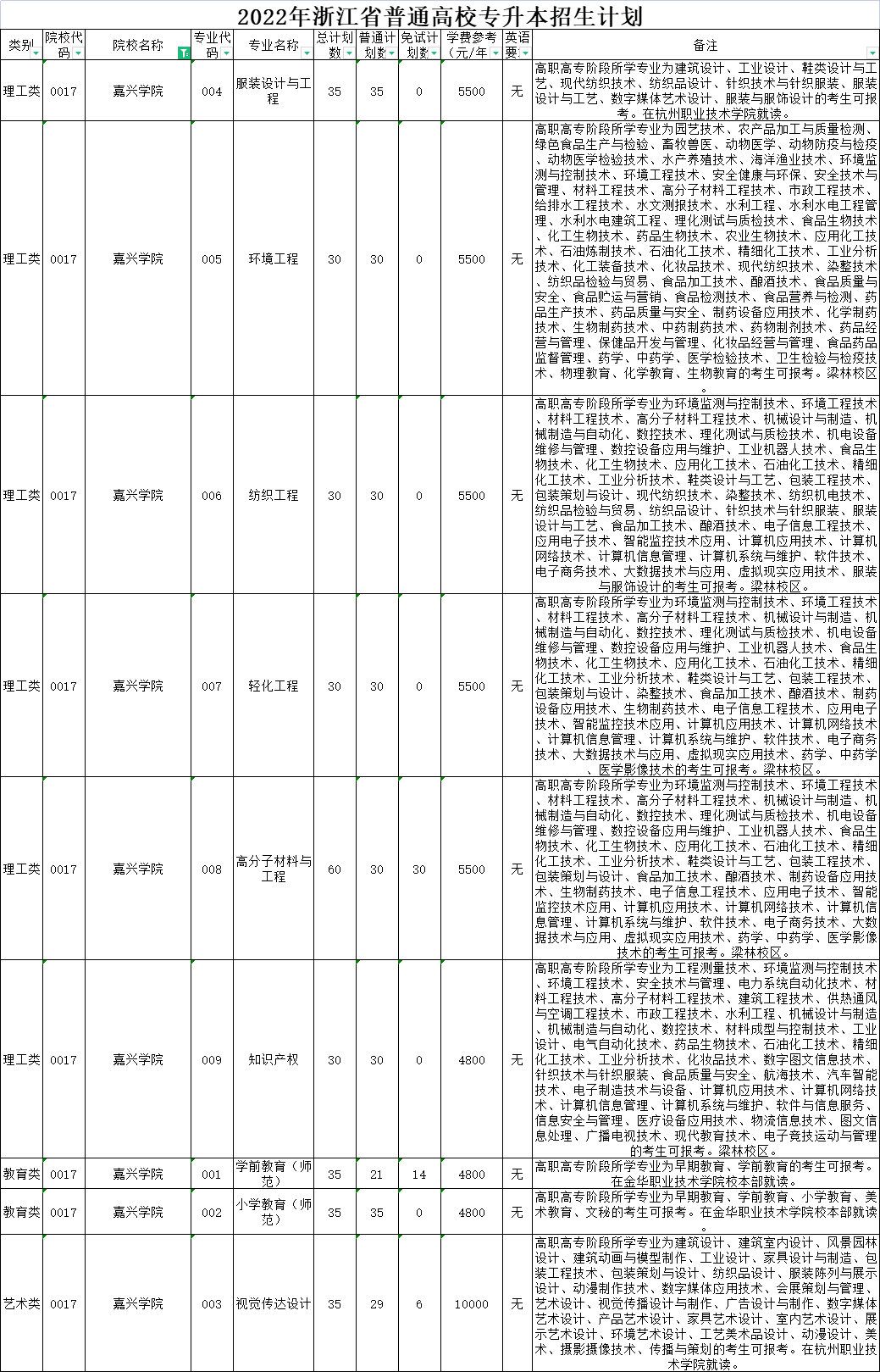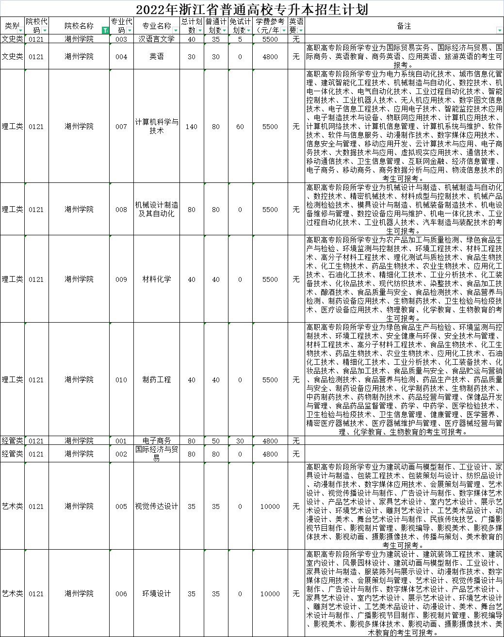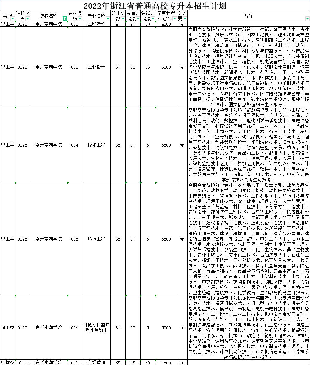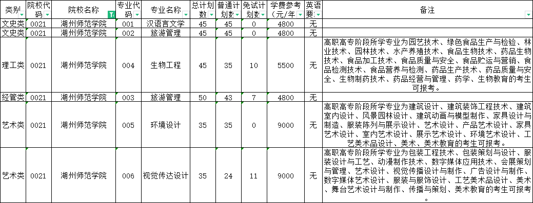 | 理工类 | 0020 | 杭州师范大学 | 008 | 环境工程 | 40 | 40 | 0 | 6000 | 无 | 高职高专阶段所学专业为设施农业与装备、农产品加工与质量检测、绿色食品生产与检验、园林技术、工程测量技术、环境监测与控制技术、环境工程技术、安全健康与环保、安全技术与管理、工程安全评价与监理、材料工程技术、高分子材料工程技术、风景园林设计、园林工程技术、建筑工程技术、建筑设备工程技术、供热通风与空调工程技术、建筑电气工程技术、建筑智能化工程技术、消防工程技术、建设工程管理、工程造价、市政工程技术、给排水工程技术、水文测报技术、水利工程、水利水电建筑工程、理化测试与质检技术、工业工程技术、化工生物技术、药品生物技术、应用化工技术、石油化工技术、精细化工技术、工业分析技术、化工装备技术、食品检测技术、化学制药技术、道路桥梁工程技术、化学教育的考生可报考。下沙校区就读。 |