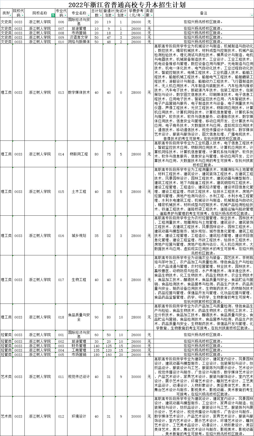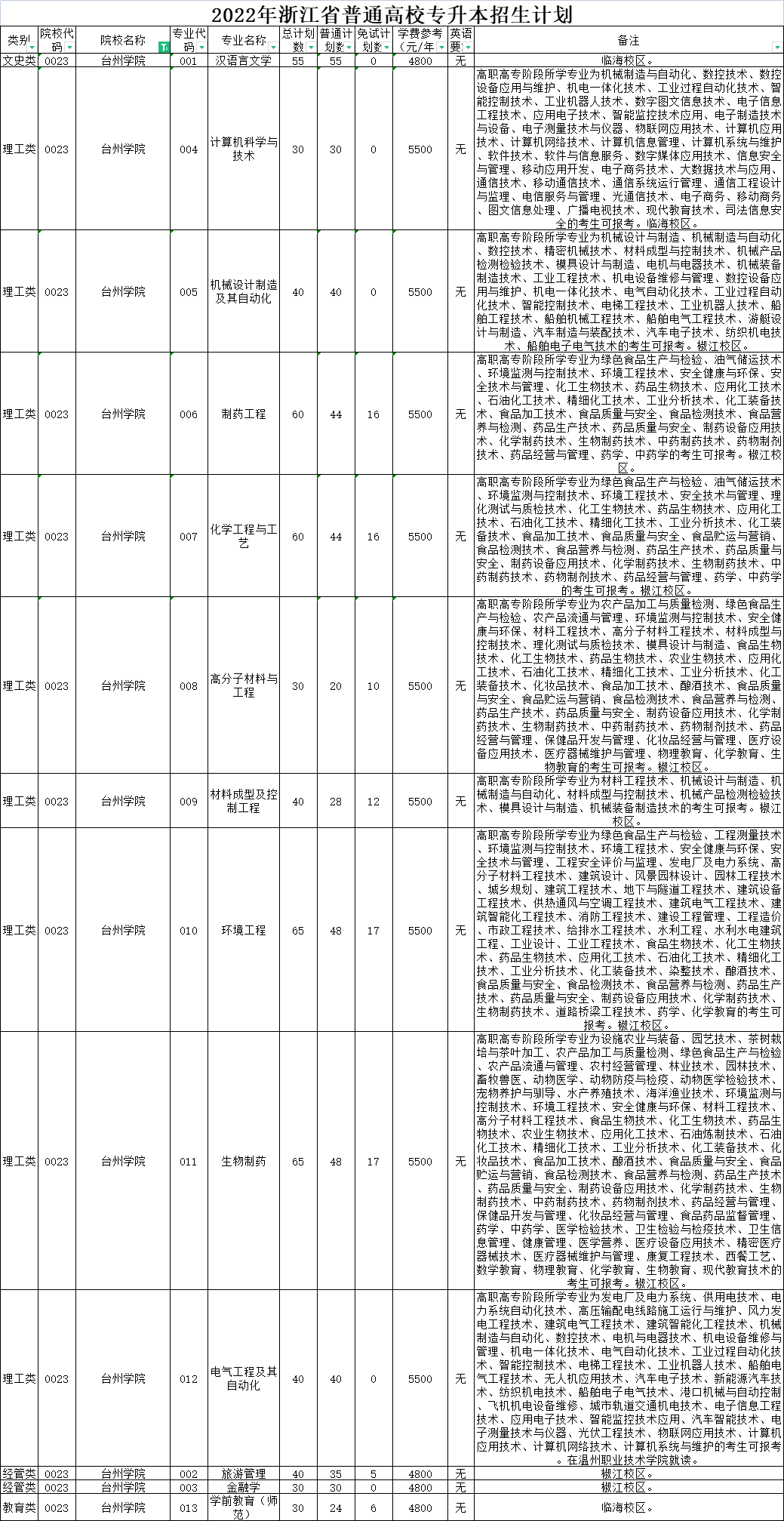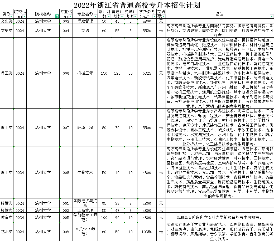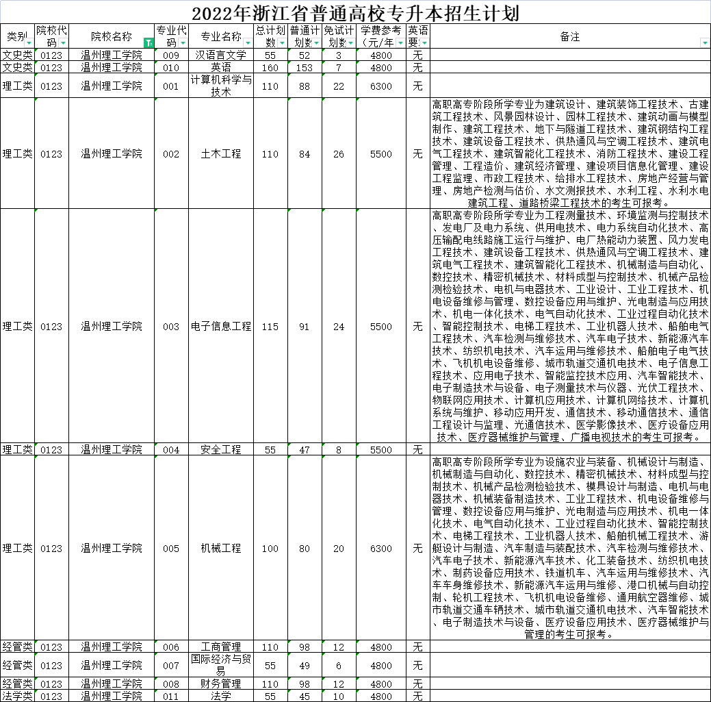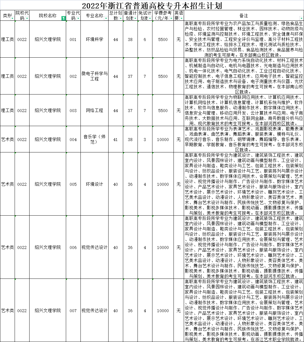 | 理工类 | 0020 | 杭州师范大学 | 008 | 环境工程 | 40 | 40 | 0 | 6000 | 无 | 高职高专阶段所学专业为设施农业与装备、农产品加工与质量检测、绿色食品生产与检验、园林技术、工程测量技术、环境监测与控制技术、环境工程技术、安全健康与环保、安全技术与管理、工程安全评价与监理、材料工程技术、高分子材料工程技术、风景园林设计、园林工程技术、建筑工程技术、建筑设备工程技术、供热通风与空调工程技术、建筑电气工程技术、建筑智能化工程技术、消防工程技术、建设工程管理、工程造价、市政工程技术、给排水工程技术、水文测报技术、水利工程、水利水电建筑工程、理化测试与质检技术、工业工程技术、化工生物技术、药品生物技术、应用化工技术、石油化工技术、精细化工技术、工业分析技术、化工装备技术、食品检测技术、化学制药技术、道路桥梁工程技术、化学教育的考生可报考。下沙校区就读。 |