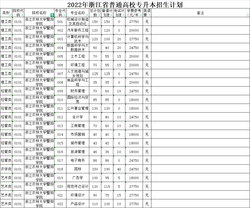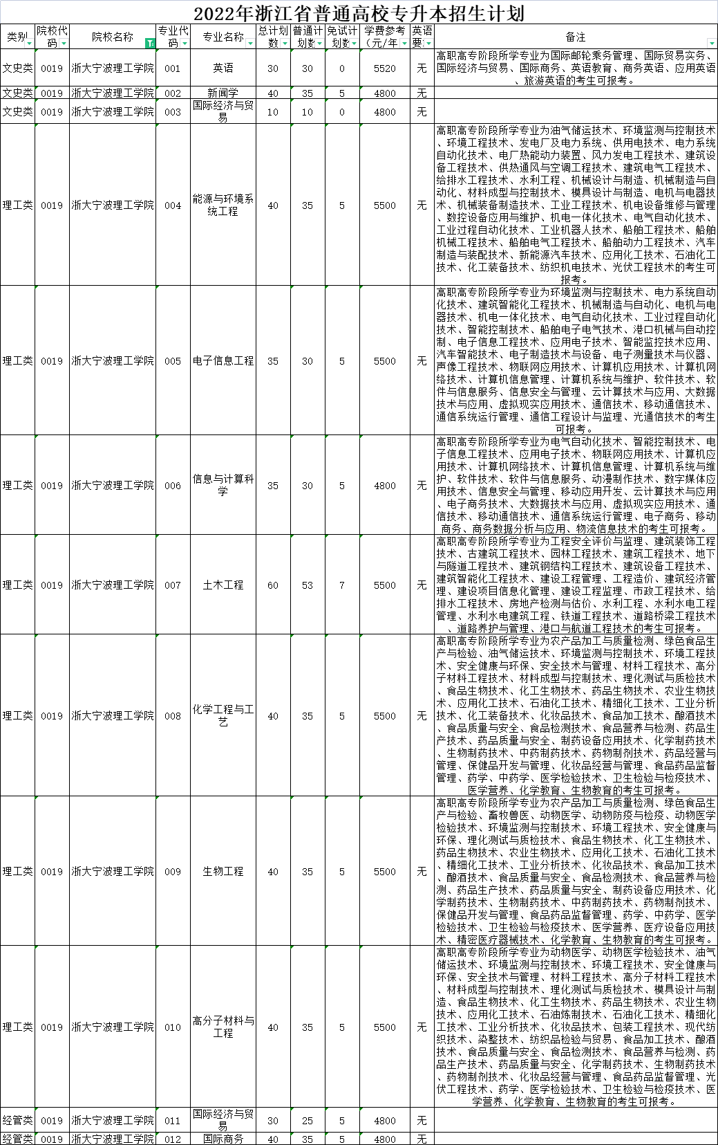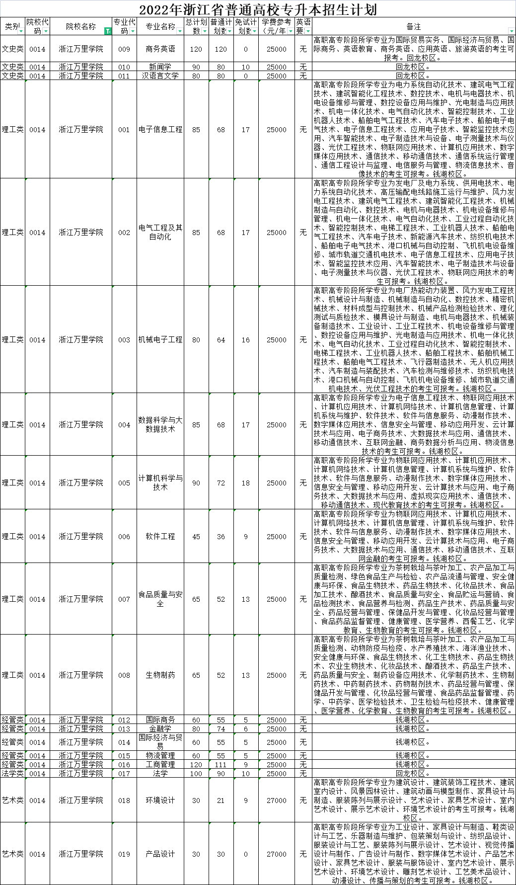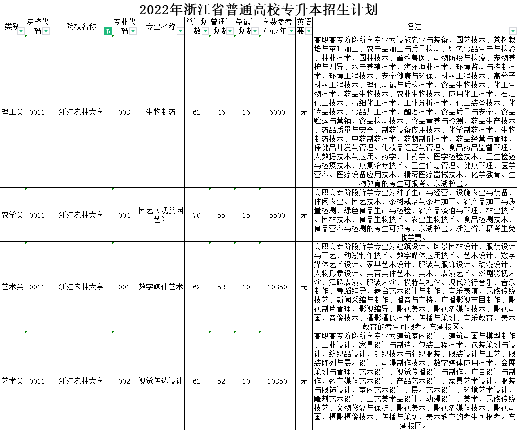 | 理工类 | 0020 | 杭州师范大学 | 008 | 环境工程 | 40 | 40 | 0 | 6000 | 无 | 高职高专阶段所学专业为设施农业与装备、农产品加工与质量检测、绿色食品生产与检验、园林技术、工程测量技术、环境监测与控制技术、环境工程技术、安全健康与环保、安全技术与管理、工程安全评价与监理、材料工程技术、高分子材料工程技术、风景园林设计、园林工程技术、建筑工程技术、建筑设备工程技术、供热通风与空调工程技术、建筑电气工程技术、建筑智能化工程技术、消防工程技术、建设工程管理、工程造价、市政工程技术、给排水工程技术、水文测报技术、水利工程、水利水电建筑工程、理化测试与质检技术、工业工程技术、化工生物技术、药品生物技术、应用化工技术、石油化工技术、精细化工技术、工业分析技术、化工装备技术、食品检测技术、化学制药技术、道路桥梁工程技术、化学教育的考生可报考。下沙校区就读。 |