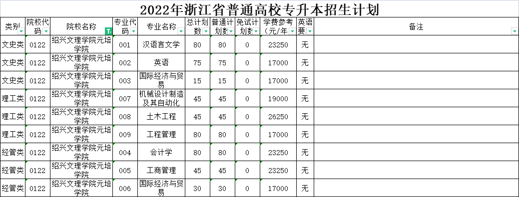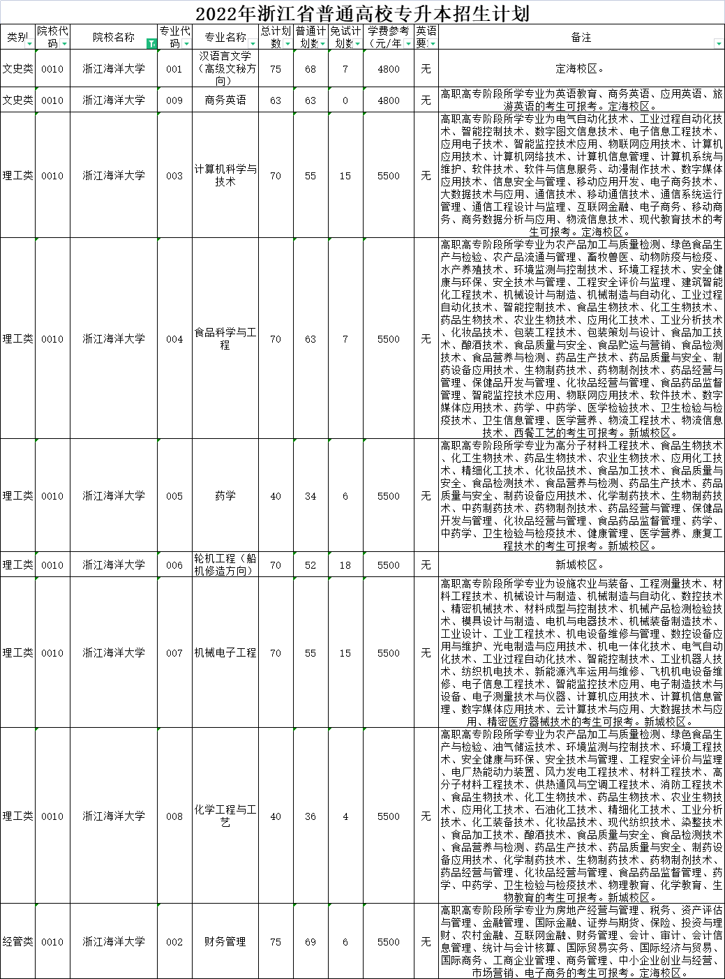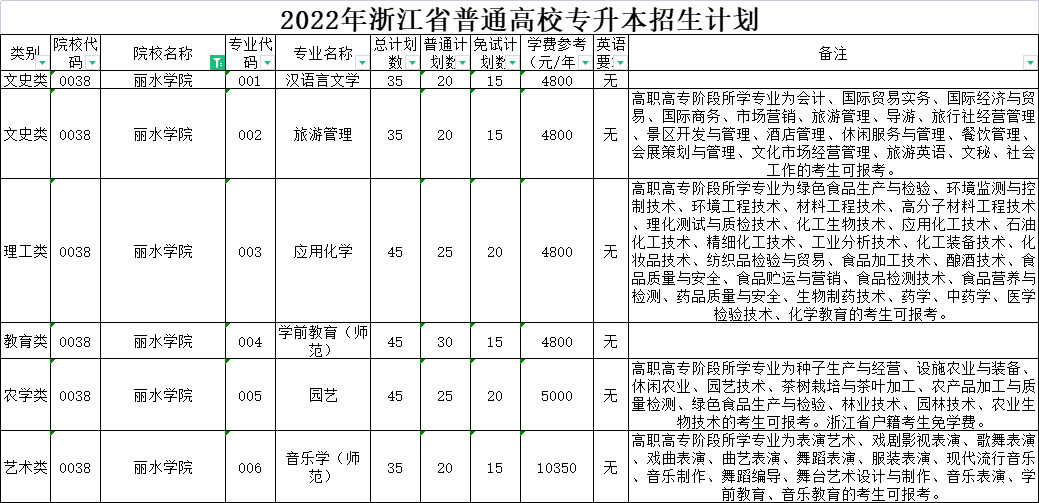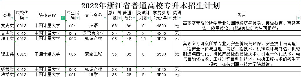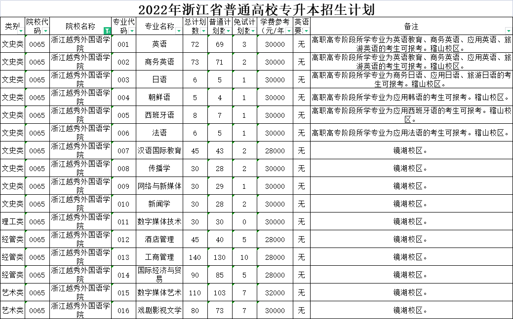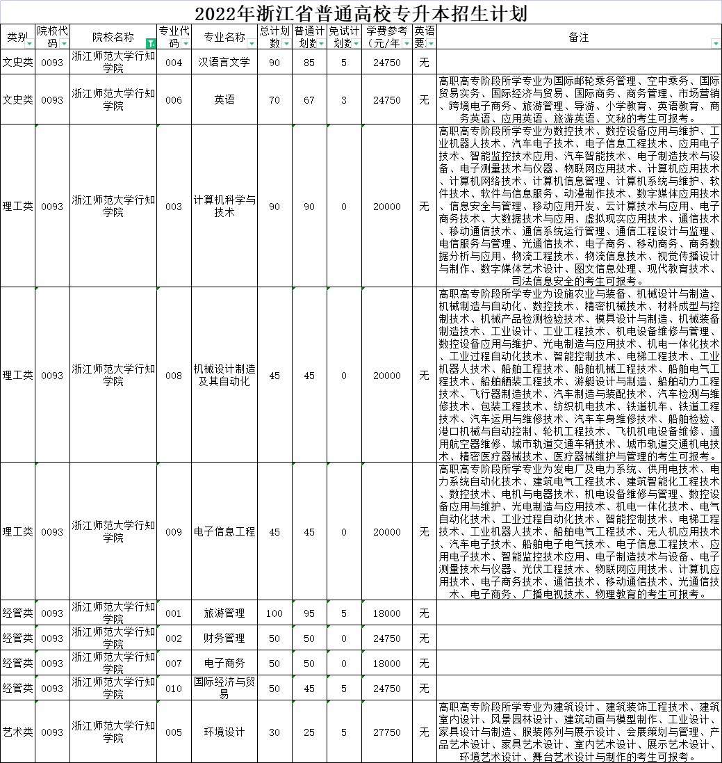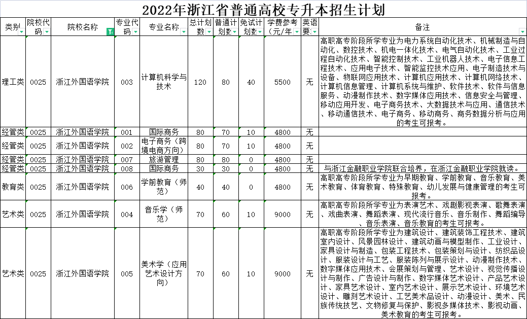 | 文史类 | 0020 | 杭州师范大学 | 001 | 英语 | 170 | 170 | 0 | 5300 | 无 | 高职高专阶段所学专业为国际贸易实务、国际经济与贸易、国际商务、英语教育、商务英语、应用英语、旅游英语的考生可报考。下沙校区就读。 |