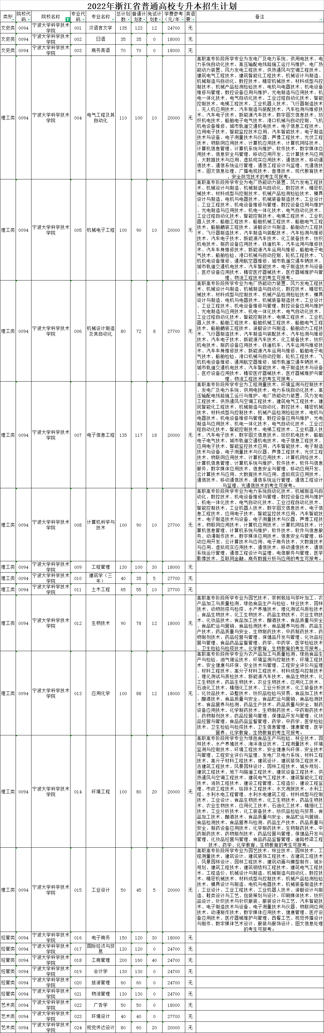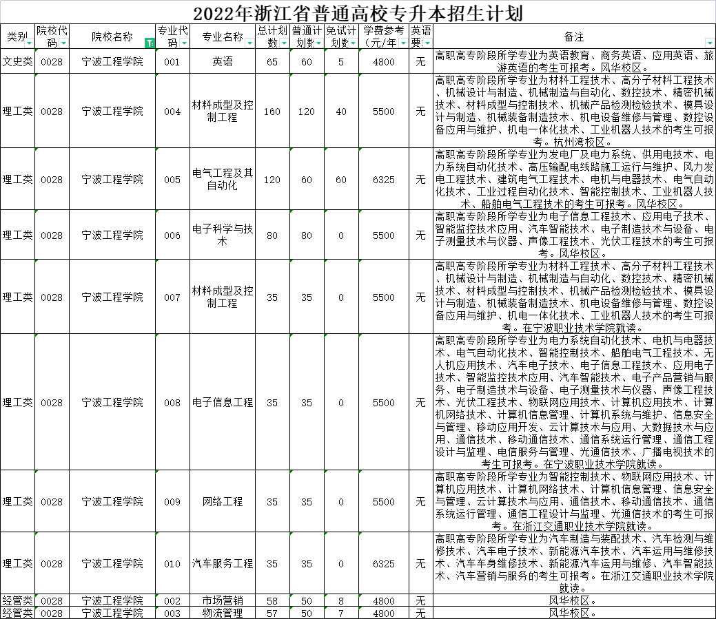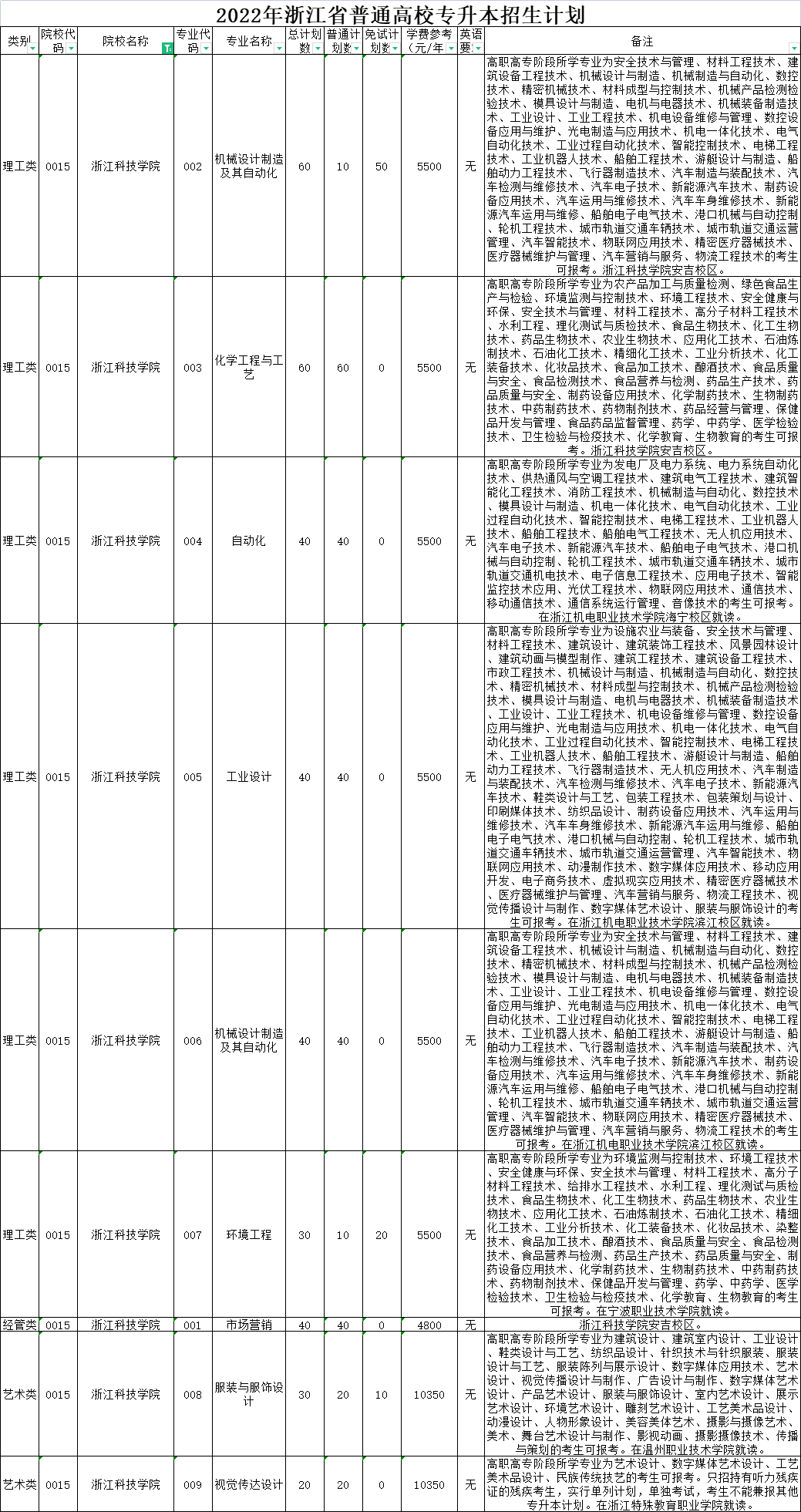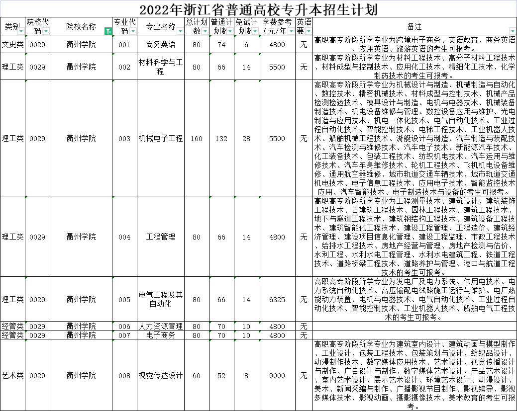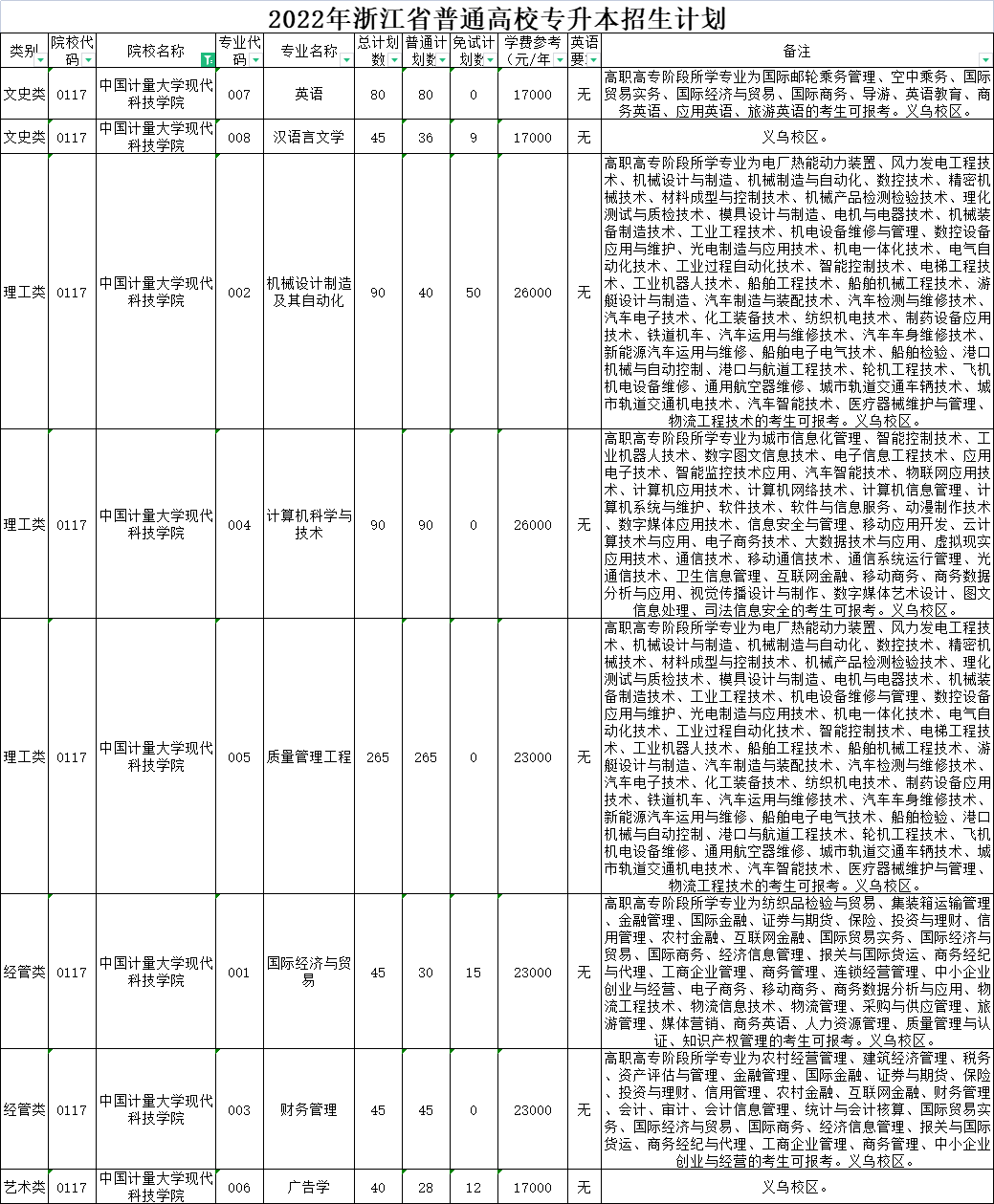| 理工类 | 0006 | 杭州电子科技大学 | 004 | 机械设计制造及其自动化 | 80 | 60 | 20 | 6900 | 无 | 高职高专阶段所学专业为机械设计与制造、机械制造与自动化、数控技术、精密机械技术、材料成型与控制技术、机械产品检测检验技术、模具设计与制造、电机与电器技术、机械装备制造技术、工业设计、工业工程技术、机电设备维修与管理、数控设备应用与维护、光电制造与应用技术、机电一体化技术、电气自动化技术、工业过程自动化技术、智能控制技术、电梯工程技术、工业机器人技术的考生可报考。在金华职业技术学院校本部就读。 |
