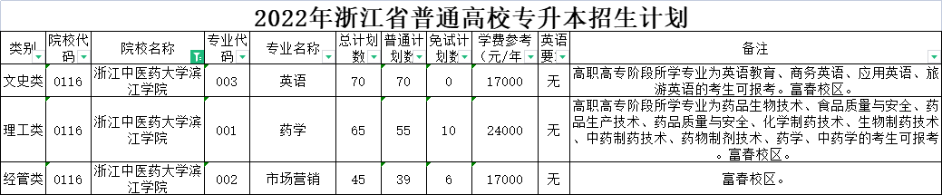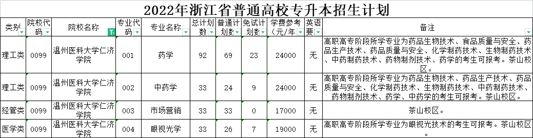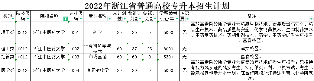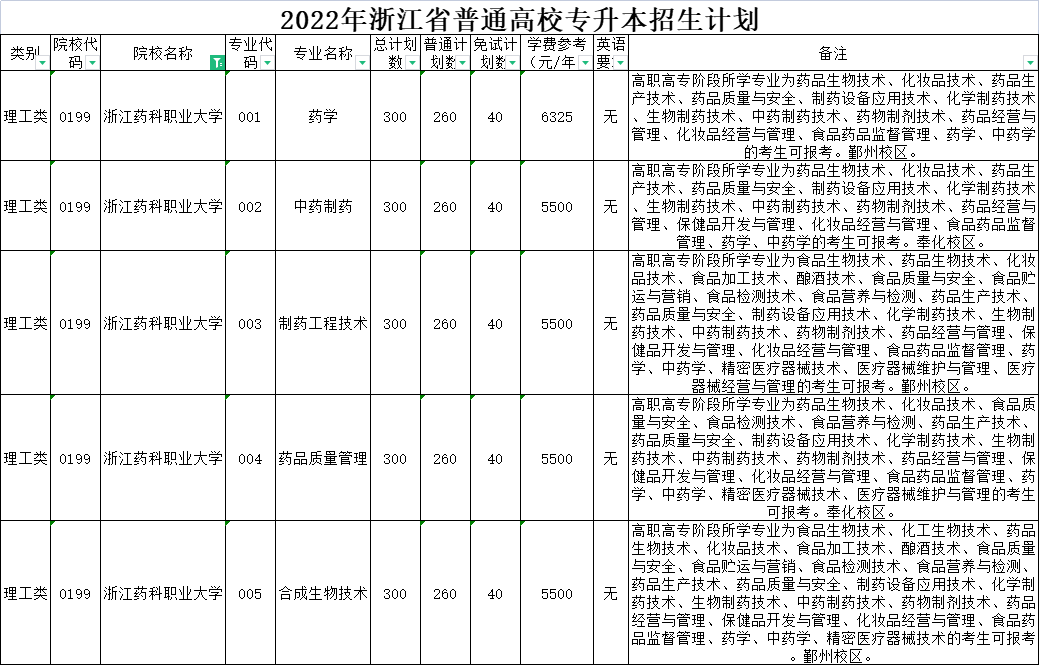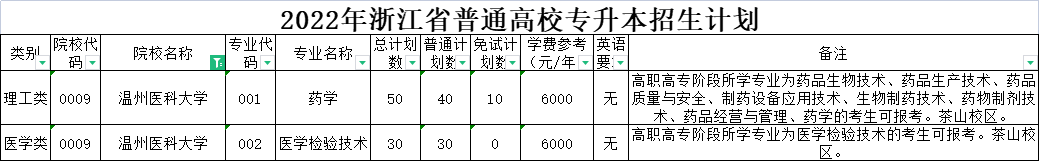 | 理工类 | 0036 | 杭州医学院 | 006 | 药学 | 120 | 120 | 0 | 5500 | 无 | 高职高专阶段所学专业为药学的考生可报考。 |