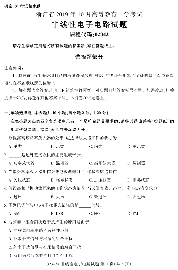对于考生们来说,现阶段就开始进行浙江自考的复习备考的话,考生们能够留给自己复习备考的空间越大。同时,考生们可以通过真题的训练来检验自己的学习成果。为了帮助考生们复习备考,浙江专升本整理了2019年10月浙江自考02342非线性电子电路试题。