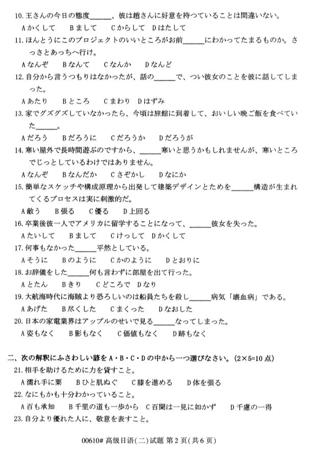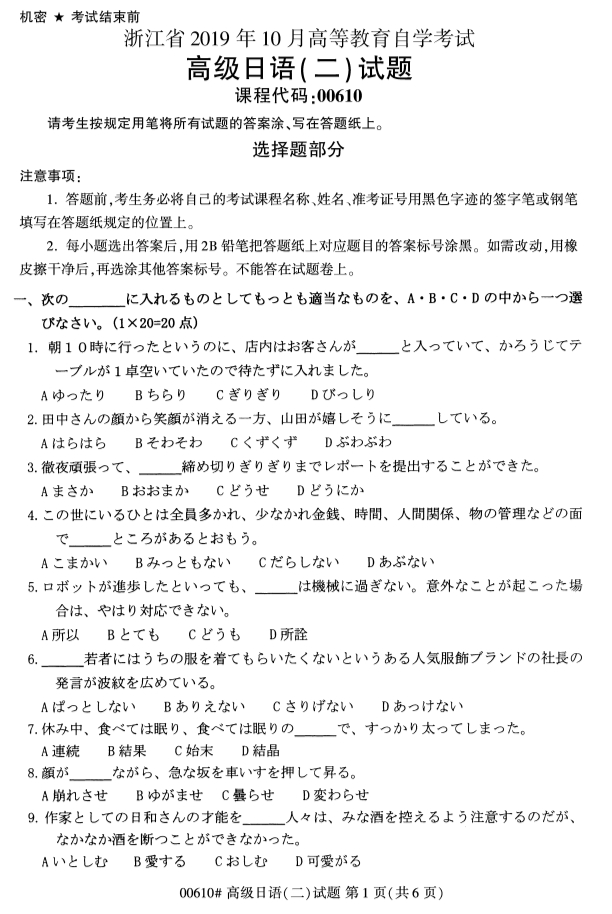 对于考生们来说,现阶段就开始进行浙江自考的复习备考的话,考生们能够留给自己复习备考的空间越大。同时,考生们可以通过真题的训练来检验自己的学习成果。为了帮助考生们复习备考,浙江专升本整理了2019年10月浙江自考00610高级日语(二)试题。