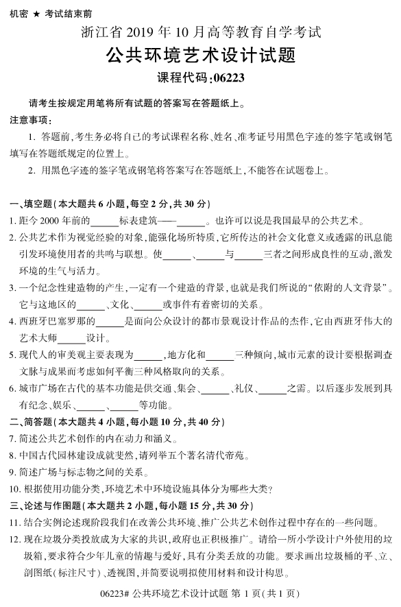 10月份的浙江成人自考落下帷幕,2019年也要接近尾声了,但是对于想要尽早获取浙江自考本科证书的考生们来说,这或许也意味着复习备考的开始,所以现阶段考生们就要制定好复习备考计划,同时必要的真题训练肯定是不可少的。今天小编为各位考生们带来2019年10月浙江自考06223公共环境艺术设计试题。
