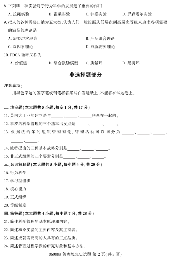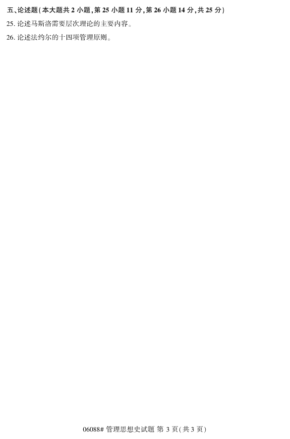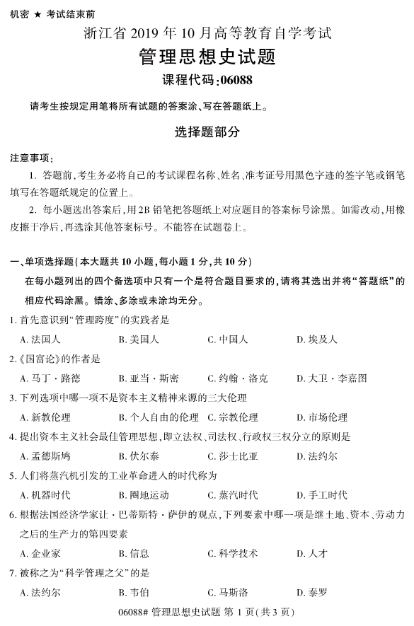 10月份的浙江成人自考落下帷幕,2019年也要接近尾声了,但是对于想要尽早获取浙江自考本科证书的考生们来说,这或许也意味着复习备考的开始,所以现阶段考生们就要制定好复习备考计划,同时必要的真题训练肯定是不可少的。今天小编为各位考生们带来2019年10月浙江自考06088管理思想史试题。
