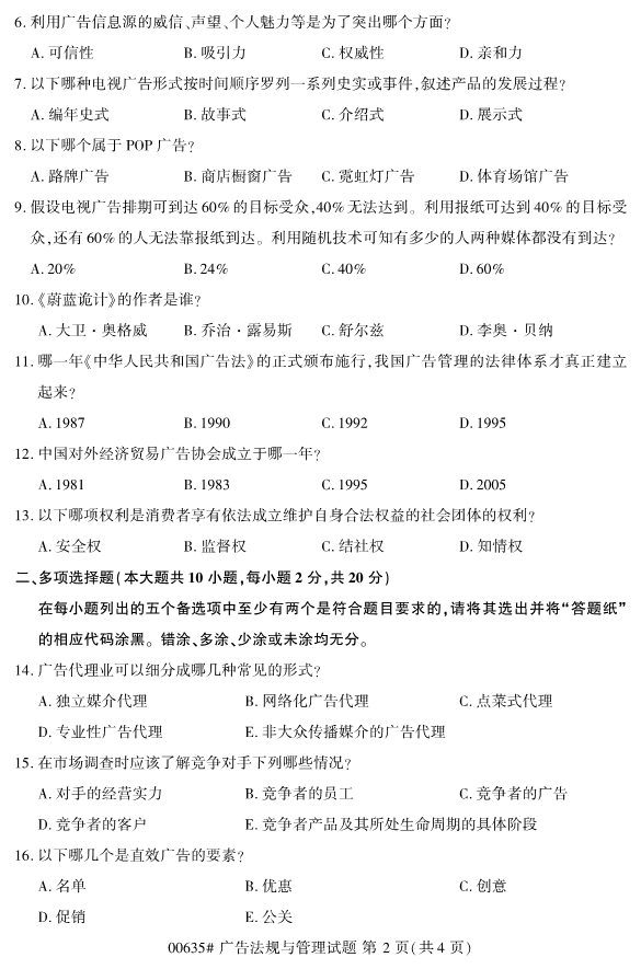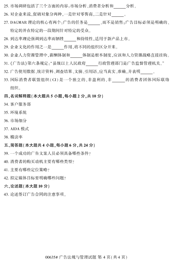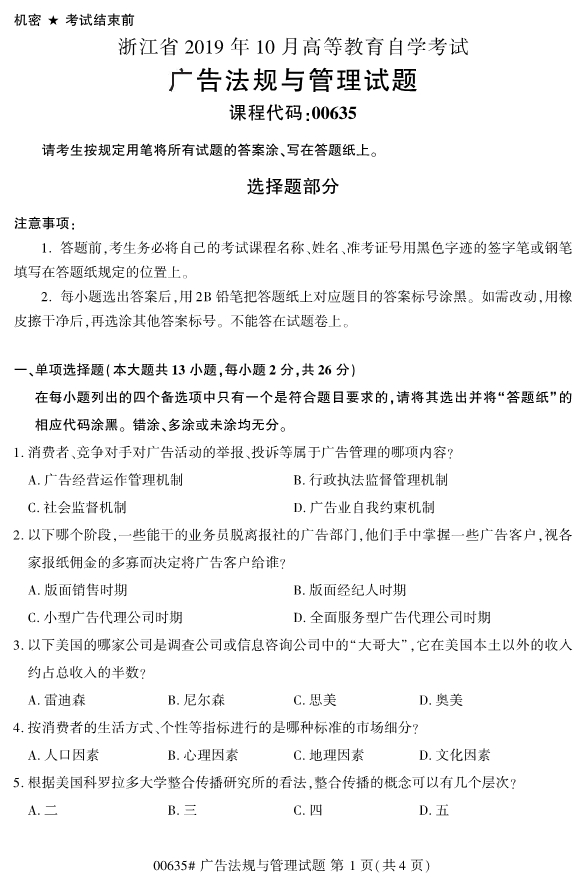 【导读】对于考生们来说,虽然还有4个月才会迎来2020年4月份的浙江自考,但是这中间真正留给考生们复习备考的时间其实不是很多。所以,考生们如果想要尽早通过浙江成人自考拿到自考本科毕业证,必须要尽早开始复习备考工作。为了帮助考生们复习备考,小编整理了2019年10月浙江自考00635广告法规与管理试题。