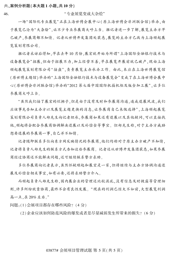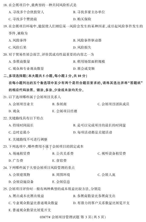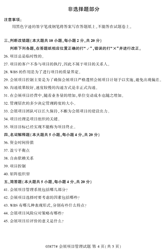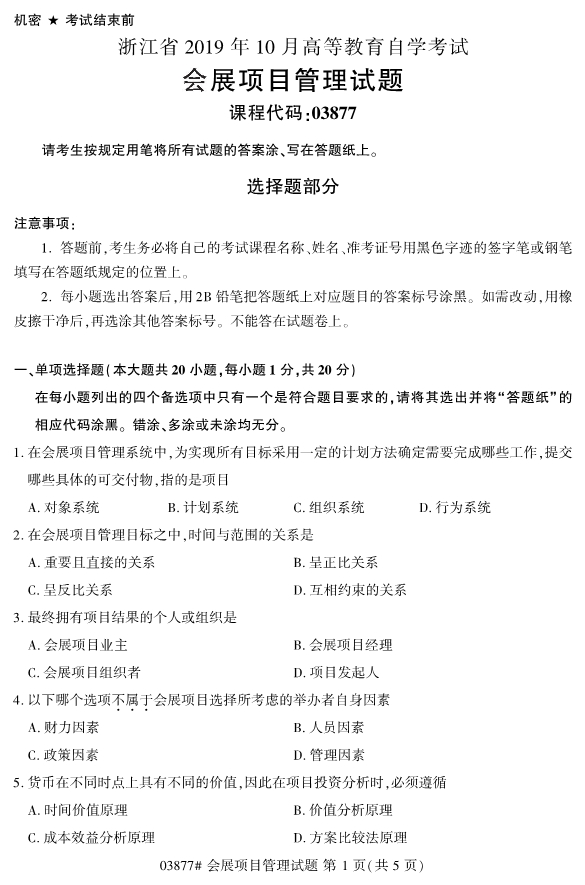 对于选择报考浙江自考的考生们来说,如何找准复习备考的重点和难点,对于没有时间准备考试的在职考生们来说显得尤为的重要,其实考试的常考考点在历练的真题中都有所体现,考生们要更高效的进行备考工作,不妨在备考过程中做一些真题。今天要和考生们分享的是2019年10月浙江自考03877会展项目管理试题。