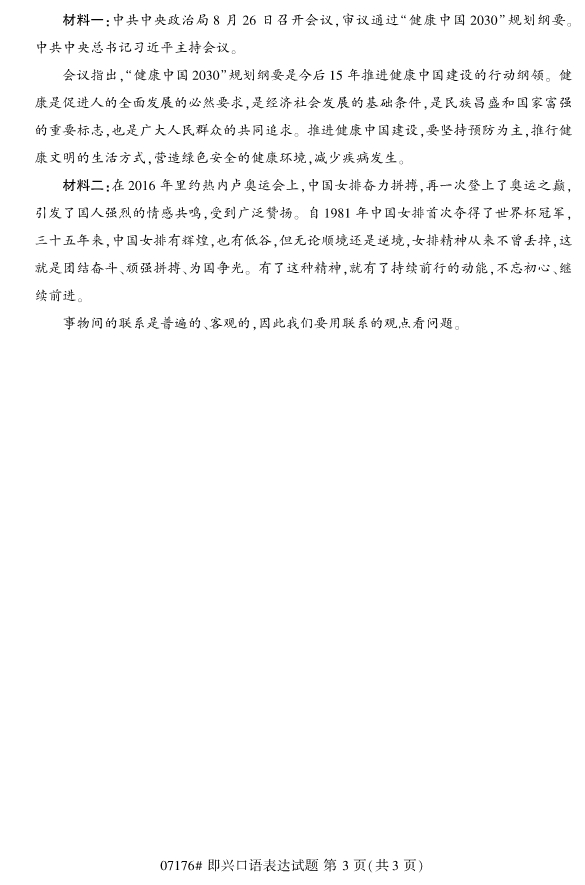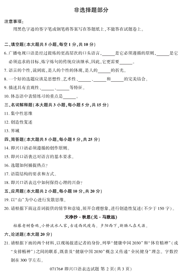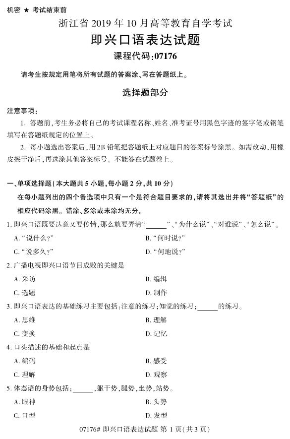 对于准备报考2020年4月份浙江自考的考生们来说,真正可以用来复习备考的时间已近不足4个月了,所以考生们首先需要确定好报考的专业和学校,其次是做好复习备考的计划。同时真题训练也是必不可少的。所以小编为考生们带来2019年10月浙江自考07176即兴口语表达试题。