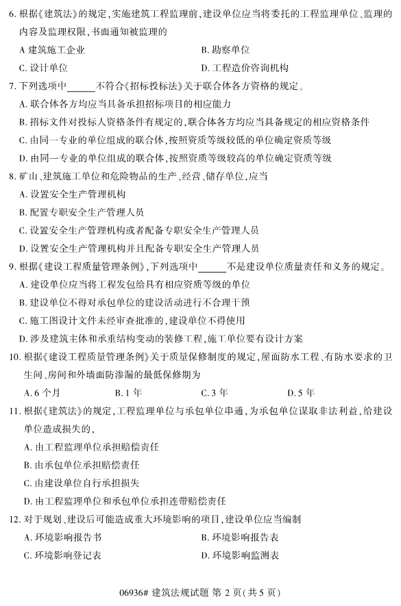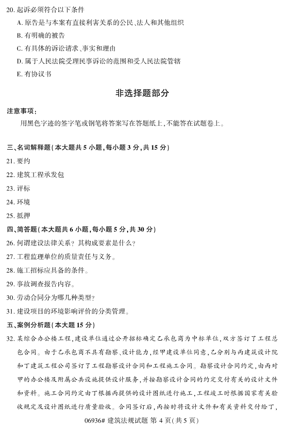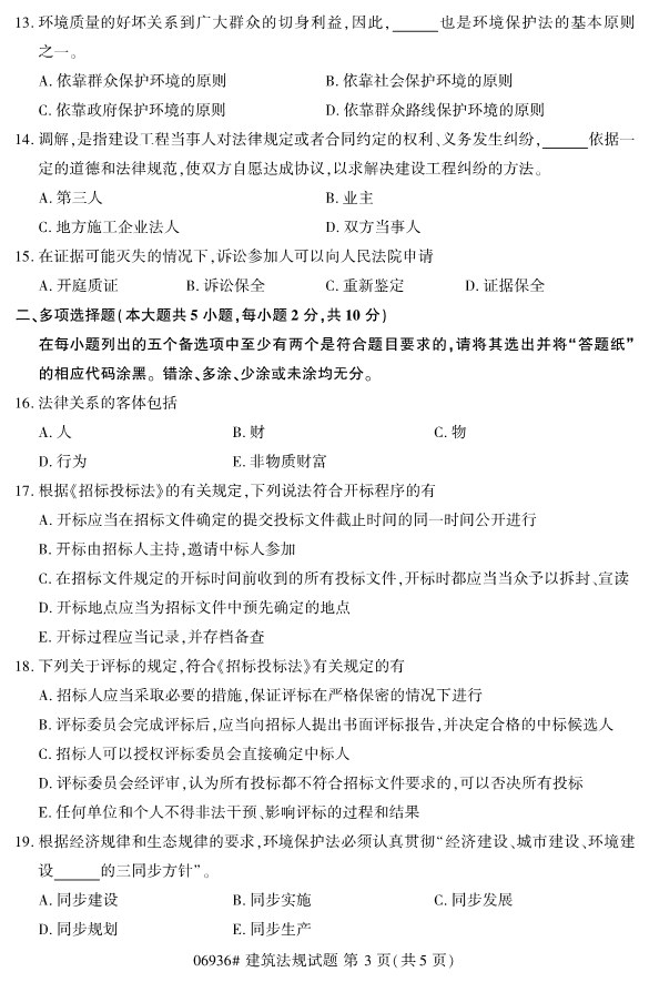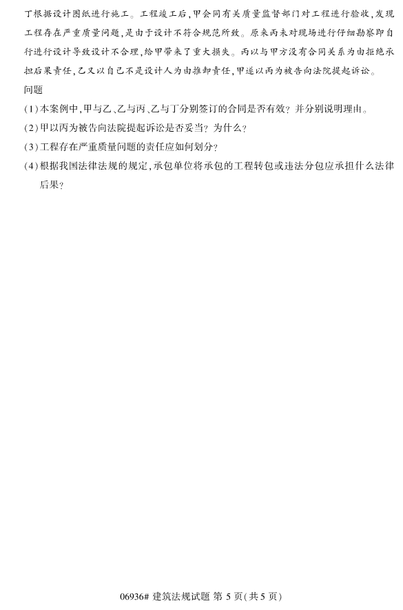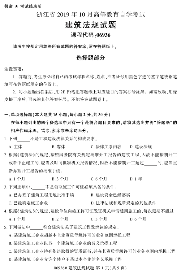 对于想要报考2020年4月份浙江自考专升本考试的考生们来说,现阶段最重要的是就是确定自考报考的专业,然后开始进行针对性的复习备考工作。对于有些考生们反映找不到考试的重点,小编建议考生们可以进行一些真题 的训练来了解考试内容。下面小编为考生们带来2019年10月浙江自考06936建筑法规试题。