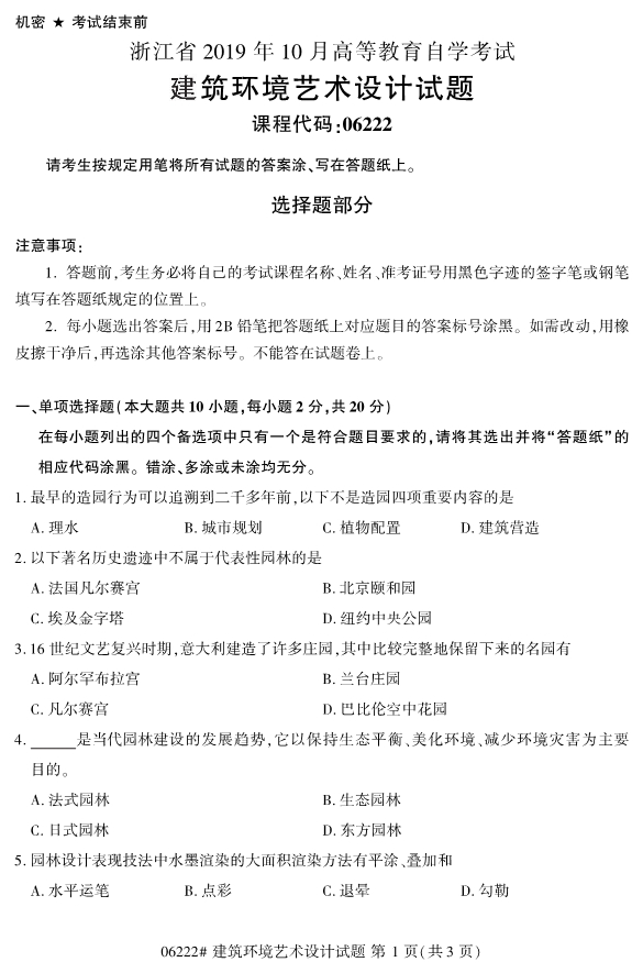 对于准备报考2020年4月的浙江自考专升本考试的考生们来说,真正可以用来复习备考的时间其实没有很多了,所以现阶段考生们就要确定好报考的专业,开始复习备考工作了,为了帮助考生们复习备考,小编整理了2019年10月浙江自考06222建筑环境艺术设计试题。