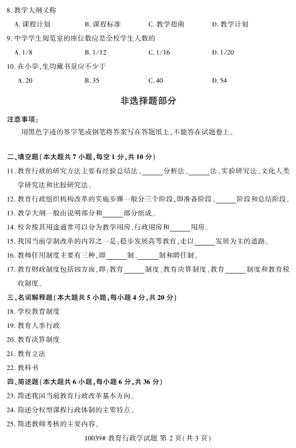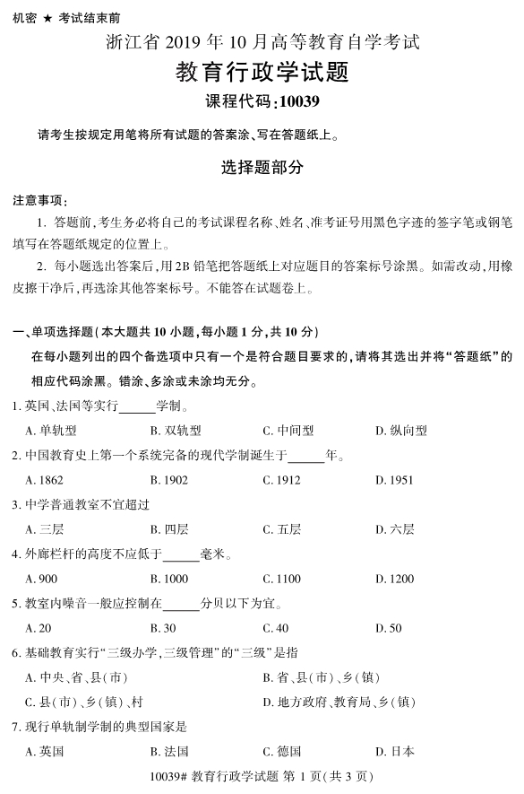 距离明年4月份的浙江成人自考专升本考试还剩不到4个月的时间了,在这一期间考生们需要确定好自己的报考专业和报考院校,然后有针对性的开始复习备考工作。为了帮助考生们备考,小编整理了2019年10月浙江自考10039教育行政学试题。