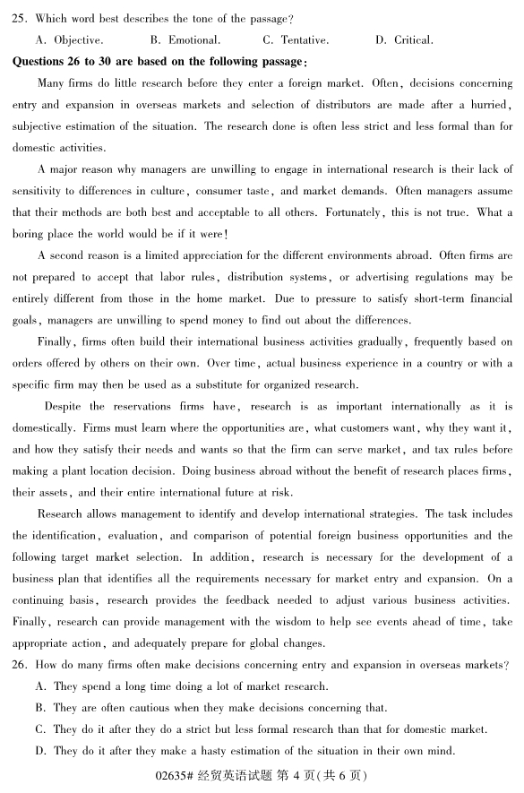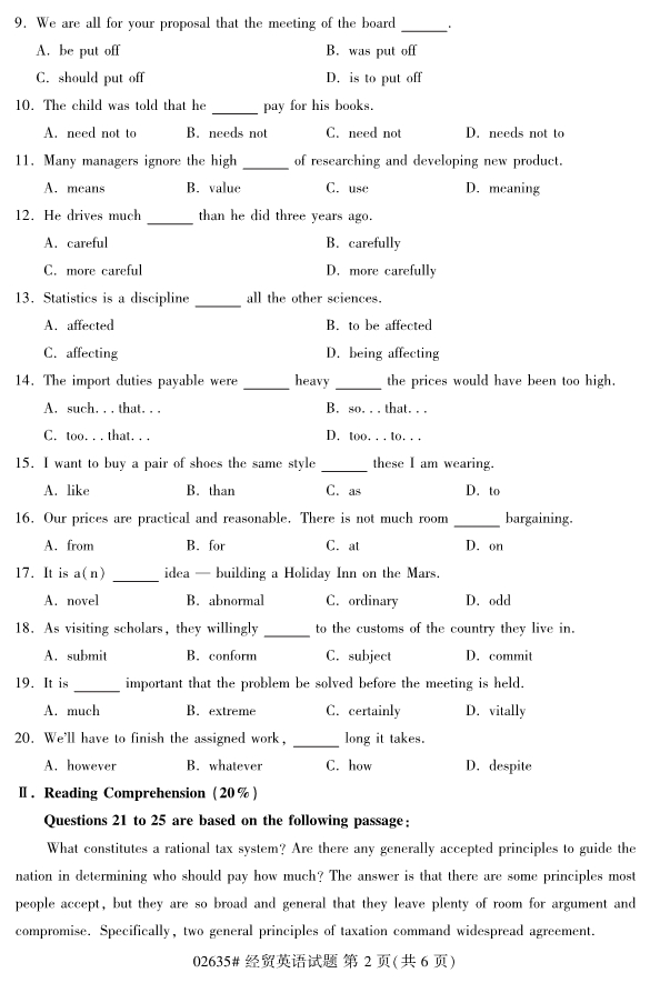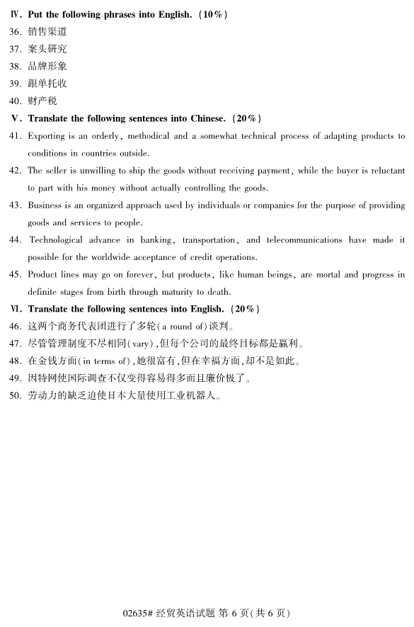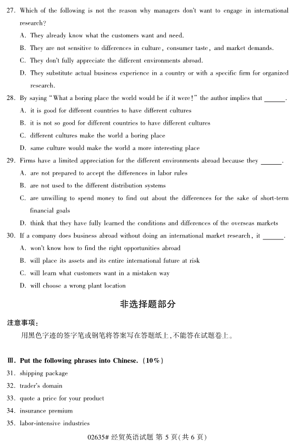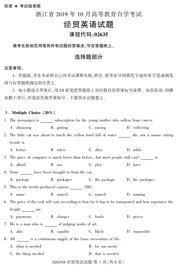 想要顺利通过浙江自考专升本考试,考生们除了需要做好日常的复习备考计划,熟记教材的相关内容外,适当的真题训练也是十分必要的。为了帮助考生们更好的进行复习备考工作,小编整理了2019年10月浙江自考02635经贸英语试题和各位考生们分享。