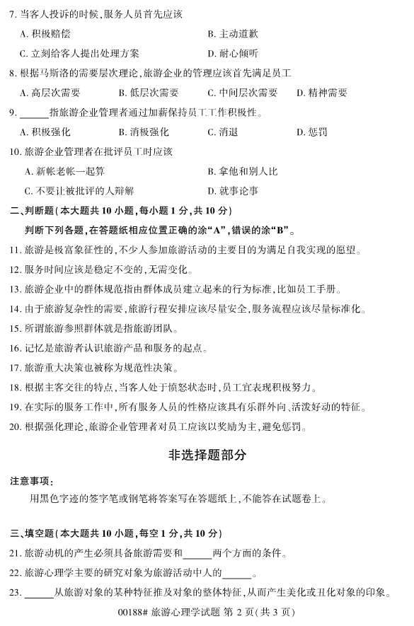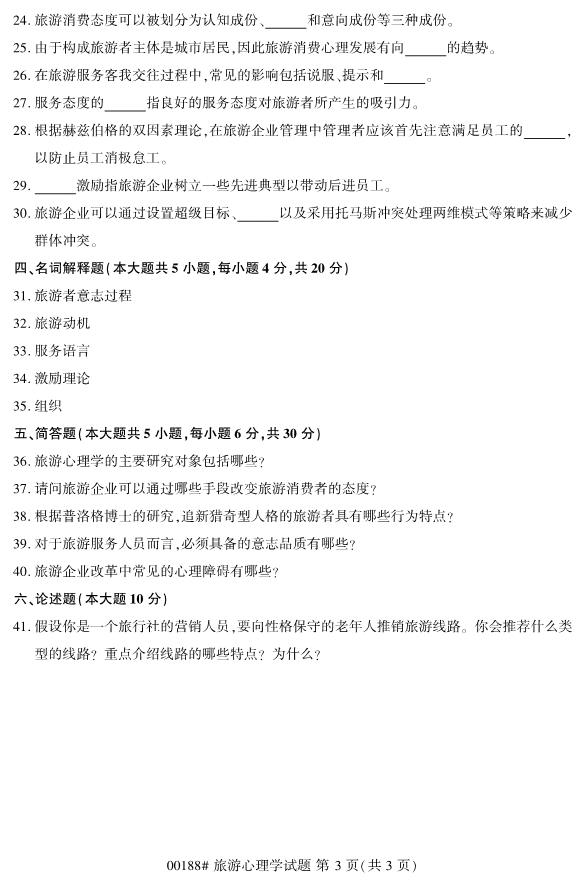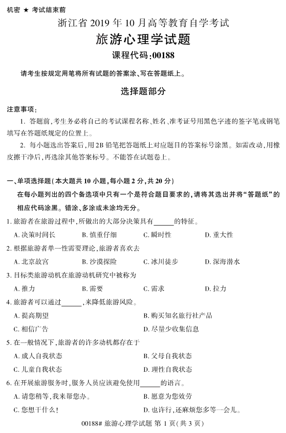 2020年已近来临,20204月浙江自考专升本考试的报名工作已经开始了。报名工作结束后,留给各位考生们复习备考的时间就所剩无几了。在复习备考过程中,真题是十分必要的。为了帮助各位考生们备考,小编整理了2019年10月浙江自考00188旅游心理学试题和各位考生们分享。