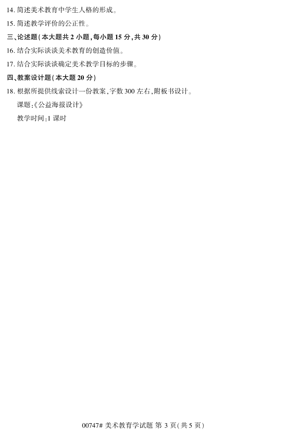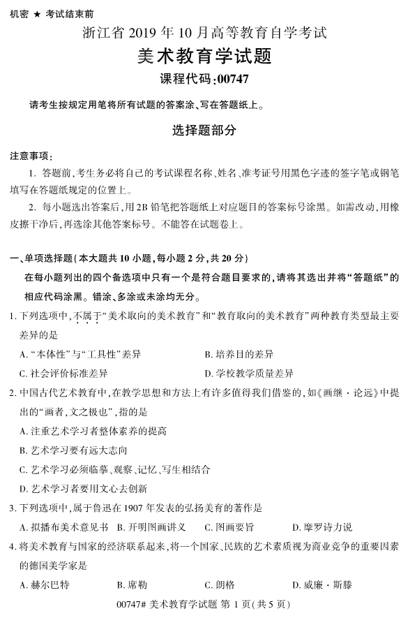 【结尾】以上就是关于2019年10月浙江自考专升本00747美术教育学试题的全部内容,考生如果想获得更多关于浙江专升本相关资讯,如浙江专升本政策公告、统招专升本、成考专升本、自考专升本、网教专升本、专升本常见问题等相关信息,敬请关注我们浙江专升本网(http://www.jswm.com.cn/)。