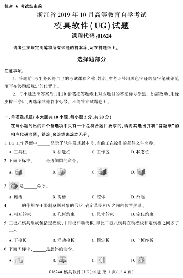 对于考生们来说,虽然还有4个月才会迎来2020年4月份的浙江自考,但是这中间真正留给考生们复习备考的时间其实不是很多。所以,考生们如果想要尽早通过浙江成人自考拿到自考本科毕业证,必须要尽早开始复习备考工作。为了帮助考生们复习备考,小编整理了2019年10月浙江自考专升本01624模具软件(UG)试题。