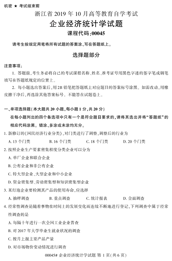 对于考生们来说,虽然还有4个月才会迎来2020年4月份的浙江自考,但是这中间真正留给考生们复习备考的时间其实不是很多。所以,考生们如果想要尽早通过浙江成人自考拿到自考本科毕业证,必须要尽早开始复习备考工作。为了帮助考生们复习备考,小编整理了2019年10月浙江自考00045企业经济统计学试题。