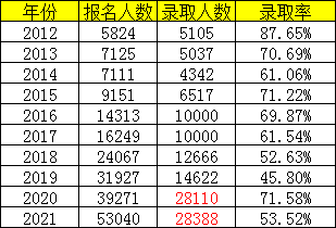 可以看到近几年的一个通过率都是下降的,只有20年进行扩招之后才上升了,但是后续的21年又降了下来,能够看出每年的通过率都是在50%左右,预计22年可能会有所下降,一方面是报考人数肯定是只增不减的,二则就是明年的一个扩招是否的问题,但是肯定会赶不上报考人数的。