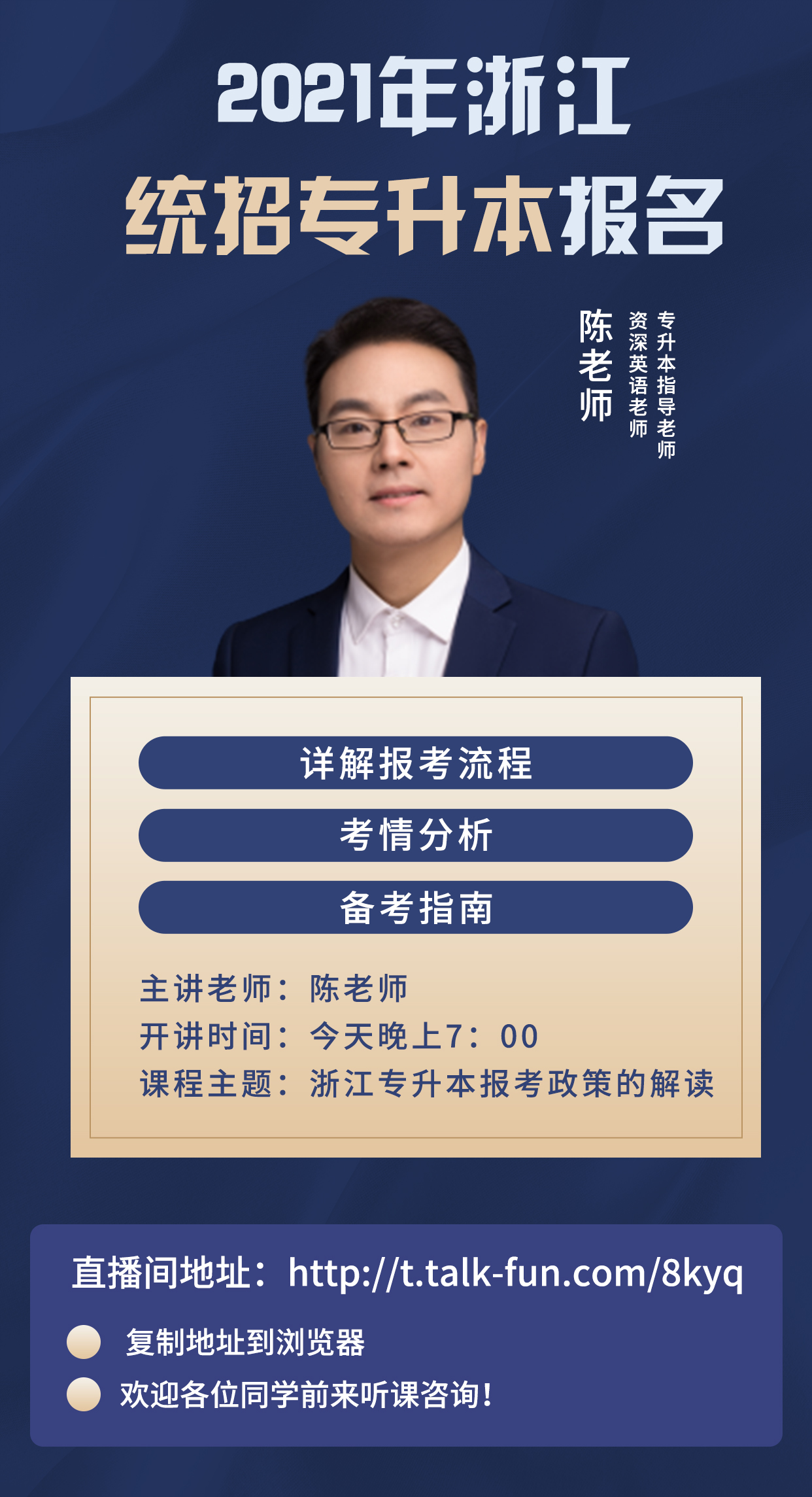 今天晚上7:00,我们将请专升本指导老师陈老师在直播间给我们带来浙江专升本报考政策的解读,给大家详解报考流程,考情分析,备考指南!欢迎大家按时进入直播间观看!